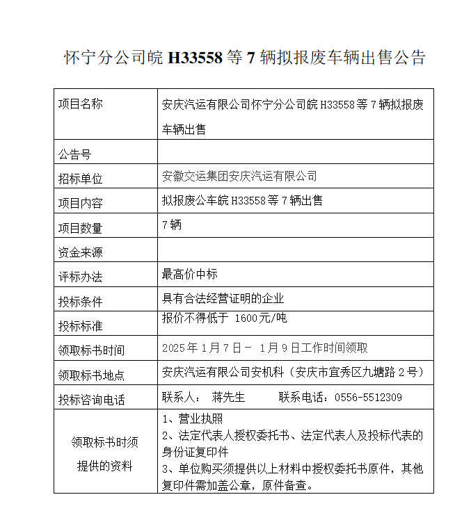 懷寧分公司皖H33558等7輛擬報廢車輛出售公告