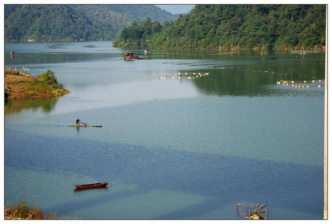 不知過了多久!也不知穿過了多少座隧道!我依然沉浸在遠(yuǎn)離凡塵喧囂的鬧市、相伴于群山峻嶺,四季如春綠油油松柏夾雜著少許紅楓秋葉的幻想之中,間或在轉(zhuǎn)瞬即逝日薄西山的余暉照映下熠熠生輝!此時(shí)此刻的我已經(jīng)是到了忘我的最高境界,腦中忽然閃過歐陽老翁的一句至理名言——【醉翁之意不在酒,而在乎山水之間!】這句話用在此處真的是妙不可言!我那萬千思緒隨著飛馳的車輪早已飄到九霄云外,暗自為窗外如畫如詩的景象所迷惑、所陶醉、所依戀...!猛然間聽到一句非常熟悉且溫暖的話——爸爸!快看!到了磨子潭風(fēng)景觀賞區(qū)了!我才恍然如夢驚醒,朝遠(yuǎn)處向下望去好一個(gè)一望無際的“磨子潭”!其潭水清澈,魚影可現(xiàn);微風(fēng)襲來,碧波蕩漾;譚中游筏,漁歌互答;這時(shí)女兒也詩意助興了!滿懷深情地吟誦——“磨子潭水-深千尺,不及‘爸媽’-送我情!”這句真是太絕了!女兒漸漸地長大了,懂得感恩戴德了。車子終于快要鉆進(jìn)最后一個(gè)隧道了,我也不知道它是排第幾?感覺今天好像是專乘“高速隧道”之旅了?!在快要進(jìn)入末了隧道的一霎那,我還特留戀地回頭朝窗外俯視一下,只見磨子潭中那無數(shù)的‘網(wǎng)箱’把整個(gè)潭水劃分成大小不等的方塊,好像一張碩大無比殘缺不全的圍棋盤面撒在幽深的譚中,我還來不及細(xì)數(shù)就立刻消失在我難以忘卻的視線中.....!
