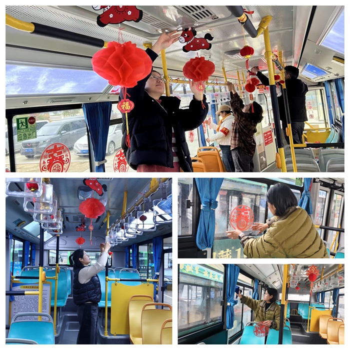 太湖公交分公司從網(wǎng)上精選現(xiàn)代窗花,搭配寓意深遠(yuǎn)的生肖燈籠,把年俗文化與時(shí)代印記巧妙融入八米車廂,讓濃濃的年節(jié)氣息伴隨每一位乘客的旅途。許多乘客一上車,看到福字和馬年燈籠,就紛紛感慨:“特別有過年的感覺,心里暖洋洋的!”