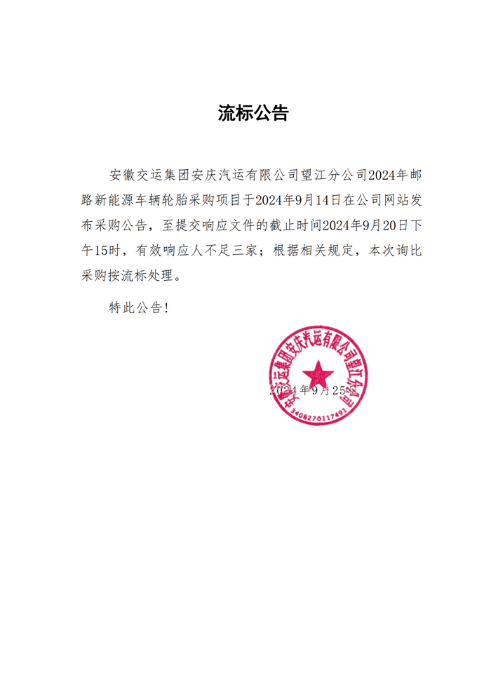 望江分公司郵路新能源車輛輪胎采購流標公告