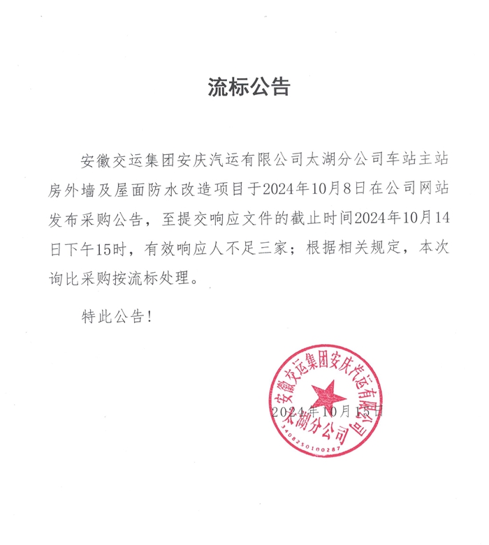 太湖分公司車(chē)站主站房外墻及屋面防水改造項(xiàng)目流標(biāo)公告